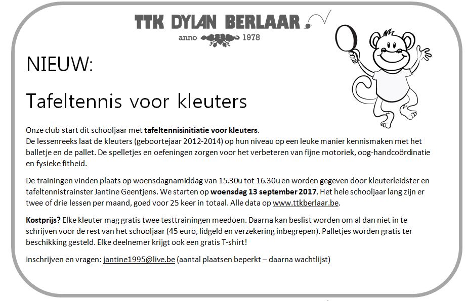 Onze club start dit schooljaar met tafeltennisinitiatie voor kleuters. De lessenreeks laat de kleuters (geboortejaar 2012-2014) op hun niveau op een leuke manier kennismaken met het balletje en de pallet. De spelletjes en oefeningen zorgen voor het verbeteren van fijne motoriek, oog-handcoördinatie en fysieke fitheid.