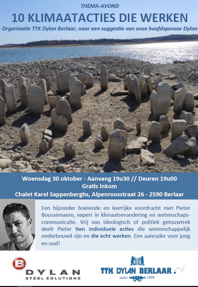 Graag nodigen we iedereen uit in het clublokaal van TTK Dylan Berlaar (Alpenroosstraat 26) op woensdag 30 oktober om 19u30 voor een boeiende thema-avond met de titel ’10 klimaatacties die werken', gebracht door klimaatexpert Pieter Boussemaere. Vrij van ideologisch of politiek getouwtrek geeft hij tien persoonlijke acties die wetenschappelijk onderbouwd zijn. Wat helpt écht en wat is eerder zinloos? Interessant voor al wie wil bijleren over dit actuele thema. Deze thema-avond wordt georganiseerd na een suggestie van onze hoofdsponsor Dylan. Lees meer
