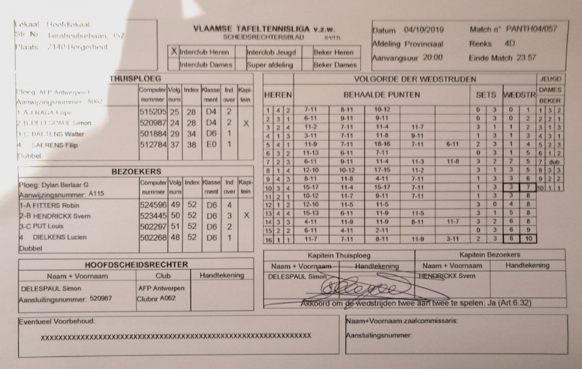 Aan "de rust" stond het nog altijd wel 5-3 voor Berlaar maar de riante uitgangspositie werd dus wel verkleind door die twee overwinningen van AFP. Gelukkig mochten Loes en Louis meteen weer revanche nemen en dat deden ze dan ook met verve. Beide wonnen hun match met 3-1. Berlaar dus weer stevig aan de leiding met 7-3. Svern en Robin konden nu al de buit binnenhalen maar met de twee D4'en als tegenstand geen directe garantie op succes. Svern had helaas geen verhaal tegen Filipe Fraga en verloor met 3-0. Robin had in zijn eerste set tegen Simon met vier gelukstreffers de nodige meeval en won die set met 12-10. Set twee werd wel verloren maar in set drie en vier werd orde op zaken gesteld. 3-1 winst en dus was een puntje bij een 8-4 tussenstand voor Berlaar alvast veilig gesteld.