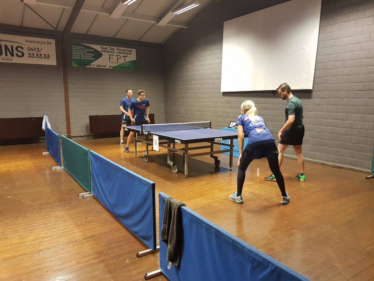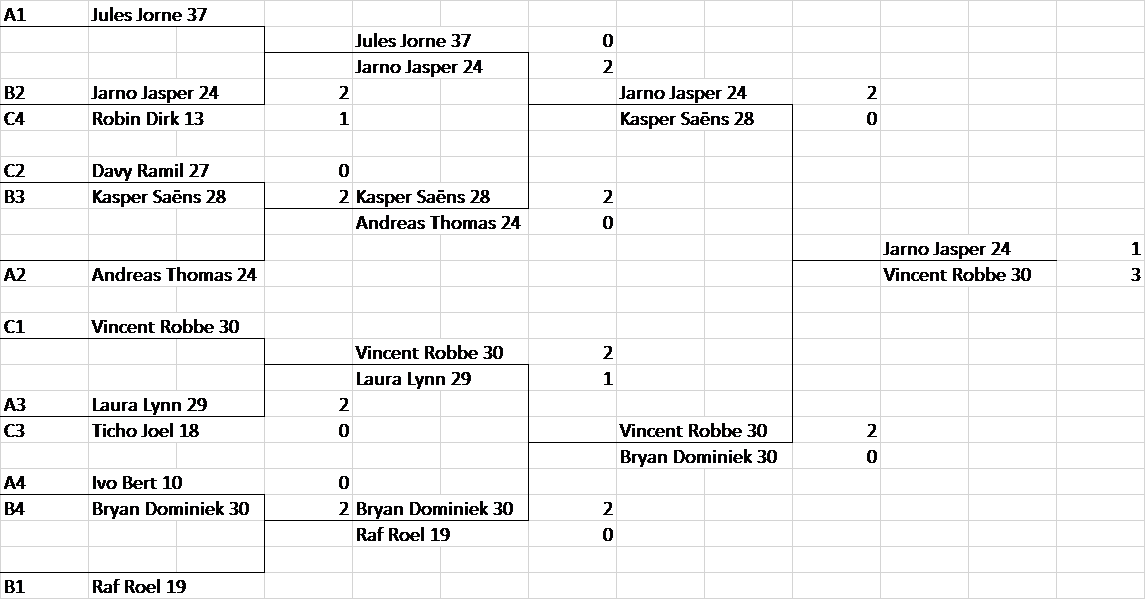 In poule C staken twee dubbels er bovenuit. Vincent en Robbe wonnen al hun zeven wedstrijden, en moesten maar één setje prijsgeven tegen Dave en Bodhi. Ook Theo en Kathleen waren goed op weg om een goede uitslag bijeen te spelen, ze hadden niet verwacht dat het zo laat ging worden en moesten de dag nadien competitie spelen en zijn dus vroeger vertrokken. Onderaan amuseerden Wilfried en Marleen zich en konden hier en daar bijna een setje afsnoepen van de tegenstanders. Door het vertrek van Theo en Marleen lag deze poule open. Davy en Ramil wonnen vier wedstrijden en werden hierdoor tweede. Er waren maar liefst vier dubbels met drie gewonnen wedstrijden, die plaats drie tem 6 moesten verdelen. Ticho en Joël kwamen er als beste uit, samen met Robin en Dirk gingen ze naar de winnaarstabel. Wendy en Dirk eindigden als vijfde. Dave en Bodhi wonnen tegen de verkeerde dubbels en eindigden als zesde.