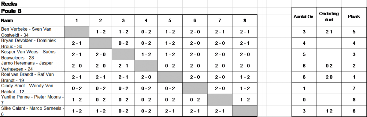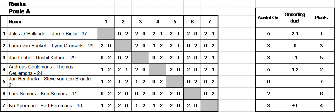 Poule A werd gewonnen door Jules en Jorne. Ze hadden net als de broers Andreas en Thomas één verliesmatch, maar hadden onderling gewonnen. Julles en Jorne verloren tegen het vrouwelijk geweld van Laura en Lynn. Zij konden zich net voor de winnaarstabel plaatsen door te winnen tegen Jan en Rushil. Ivo en Bert gingen ook mee naar de winnaarstabel. Vader Ken en zoon Lars speelden efficiënt alles in twee sets. Jan en Steve, het meest gemiddelde duo van de avond, slaagden er maar niet in om een wedstrijd te winnen. Later zal blijken dat ze zich gespaard hadden de eindfase!