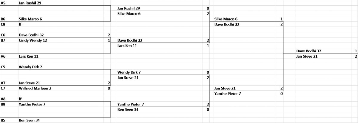 Jan en Steve hadden in de poules nog geen enkele wedstrijd winnend kunnen afsluiten, net als Wilfried en Marleen. Het toeval wil dat zij in de eerste ronde van de verliezerstabel al tegen elkaar moesten spelen. Jan en Steve wonnen deze wedstrijd en stopten niet meer met winnen. Yanthe en Pieter wonnen ook hun eerste wedstrijd van de avond tegen Ben en Sven, maar kwamen dan uit tegen Jan en Steve. Dave en Bodhi stonden ook in de finale van de verliezerstabel, hun vorige drie wedstrijden wonnen ze in de belle. Deze wedstrijd ging op en af en Jan en Steve wonnen deze met nipte cijfers in de belle.