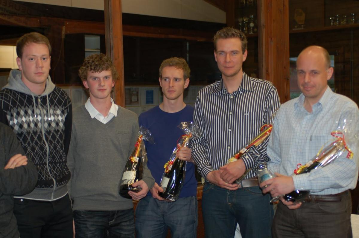 Op bovenstaande foto, op het jongste teerfeest genomen, zien we symbolisch de wissel van de wacht in onze hoogste ploeg. Rechts zien we Willy Dockx en Tom Faes. Twee trouwe Berlaar-spelers die vorig jaar als derde en vierde man de ploeg mee naar de titel brachten in Eerste Nationale. Lauren Enghien en Tom van Schil (midden) waren vorig seizoen de onbetwiste winstmachines, samen met onze Engelse speler Alim Hirji. Maar zonder Tom en Willy was er van een titel waarschijnlijk geen sprake. Links zien we dan de nieuwste Berlaarse aanwinst Florent Lamoque, die vanaf komend seizoen Tom Van Schil en Lauren Enghien mee aan winst zal moeten helpen. Werner Van den Broeck geeft hier zijn voorbeschouwing: