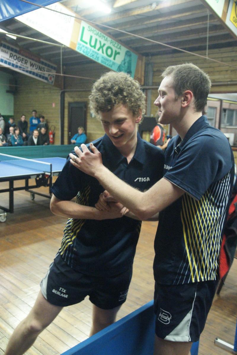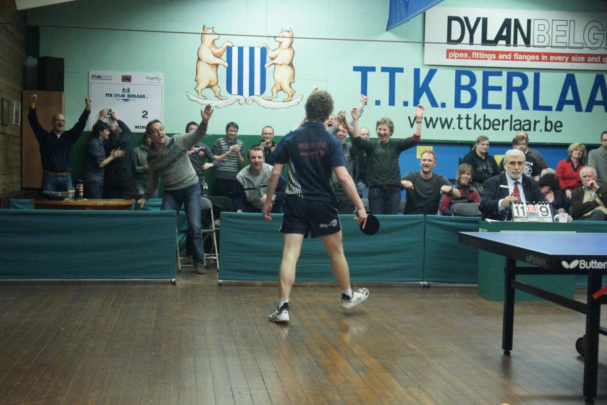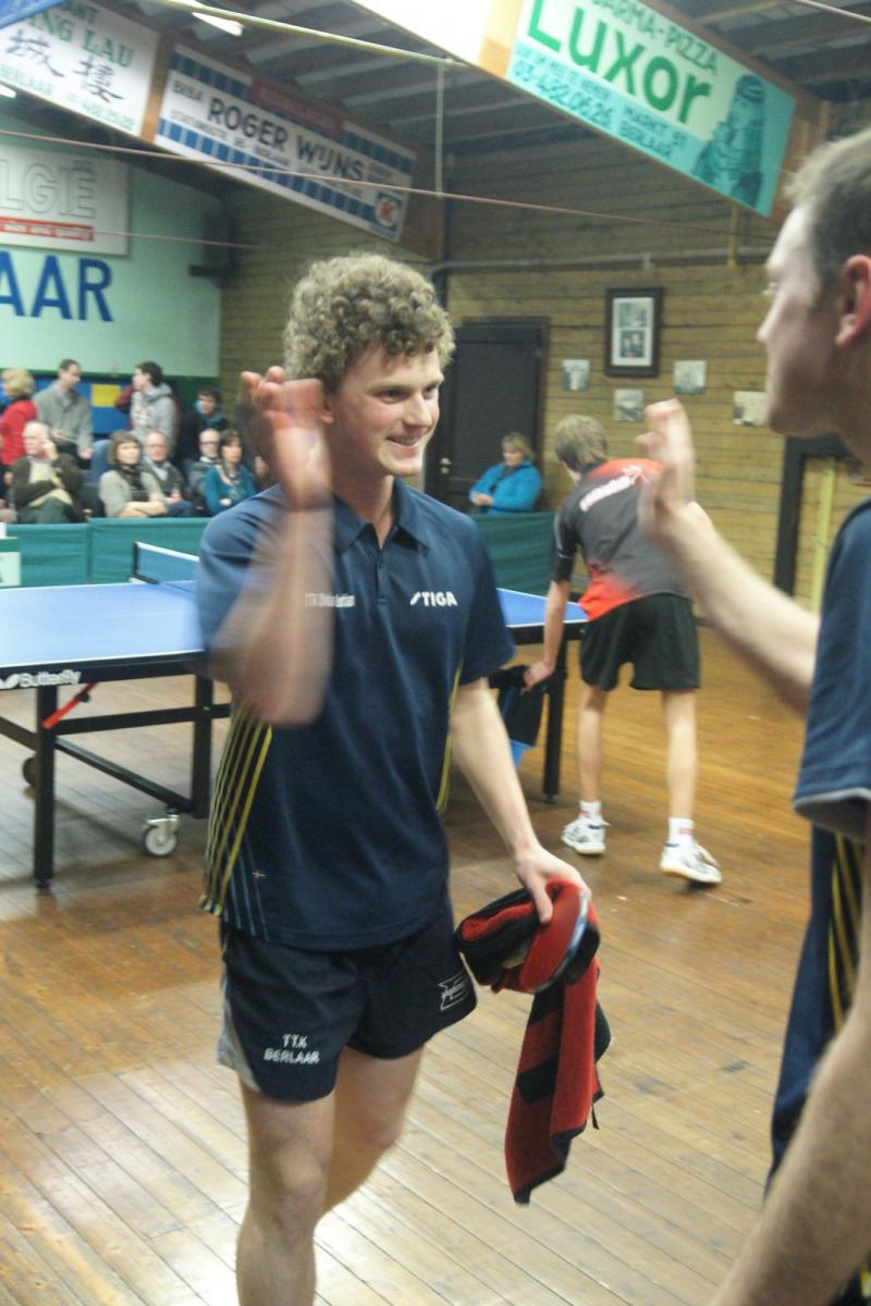 Lauren Enghien moest dan voor het beslissende vierde punt zorgen tegen Yannick Maes, die Berlaar dit seizoen al meermaals met lege handen achterliet. Maar vandaag liet Lauren hem geen kans (VIDEO). De Berlaarse jeugdspeler speelt al een tijdje op een wolk en zette zijn topprestaties van de laatste weken door. Met verfijnd, agressief en spectaculair aanvalsspel tikte hij Maes telkens uit. Na een droge 3-0 waren de zege en een oerkreet richting publiek een feit. Iedereen had op een zege gehoopt, maar niemand had er op voorhand op durven rekenen. Nadien deed Drinkhall tegen Van Schil nog wat van hem verwacht werd: zonder setverlies winnen (VIDEO), zodat de stand nog 4-3 werd.