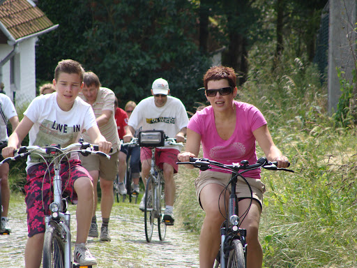 Het is zover, het summum van deze familiefietstocht: de Koppenberg, 600m lang en een maximum helling van 22% (da's 10cm meer per 5 meter). We beginnen zoals we de vorige bergjes begonnen zijn: rustig, maar met een vast & strak tempo. Opletten, want er zitten enkele veraderlijke steile hellingen in! Enkelen stappen af. Op het moment dat ik zit te denken dat het geen schande is om hier af te stappen, val ik stil en is er geen beweging meer in te krijgen. Die 10cm is er teveel aan, en we geven ons gewonnen. Slechts 4 halen het podium op de Koppenberg: Rene (uiteraard), Gie (beresterk op de fiets), Karin (met de extra NewtonMeters) en Vincent.