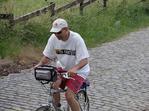 Eerste test: de Oude Kwaremont begon traagjes ("als 't zo verder gaat, zal 't wel lukken zekers"), maar na 600 meter steeg het percentage tot meer dan 11%. Jongens, iedereen valt hier bijna stil en dat blijft maar naar boven gaan. En dan die kinderkopjes nog. Het is geen schande om af te stappen, zit ik maar te denken. Naar 't stuur kijken dus, en maar trappen... met die 39-23... Na meer dan 2 km hoor ik geroep en getier van boven: Margo, die foto's aan't nemen is terwijl ik op mijn stuur zit te bijten. Nog effe alles geven, en ik ben aangekomen. Alles trilt nog een tijdje na, maar het is gelukt! Rene en Wim (den andere) zijn hier vlotjes naar boven gegaan. Die zullen wel geen 39-23 gehad hebben, denk ik dan maar ;-)