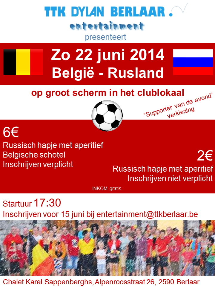 Belgie - Rusland wordt op een supergroot scherm geprojecteerd. Iedereen is welkom vanaf 17u30.