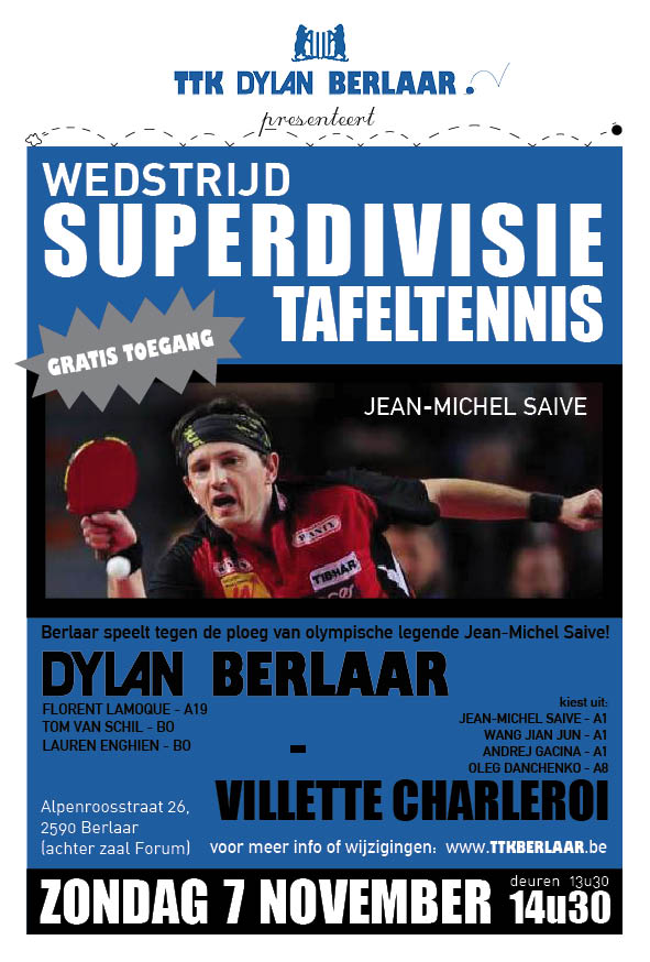 De bekendste speler van La Villette Charleroi is uiteraard Jean-Michel Saive. Hij is tot op vandaag onafgebroken de beste Belgische speler sinds 1985. Op 9 februari 1994 bereikte hij de eerste plaats op de internationale ranglijst. Hij bleef 515 dagen de beste ter wereld. In 2008 speelde hij in Peking zijn zesde opeenvolgende Olympische Spelen. Een fenomenele prestatie. In 1994 werd hij Europees kampioen in Birmingham. In 1991 en 1994 werd hij verkozen tot Belgisch sportman van het jaar. Momenteel is hij het nummer 46 van de wereld. Héél straf, zeker als je weet dat Saive tien dagen na de wedstrijd tegen Berlaar 41 jaar oud wordt.